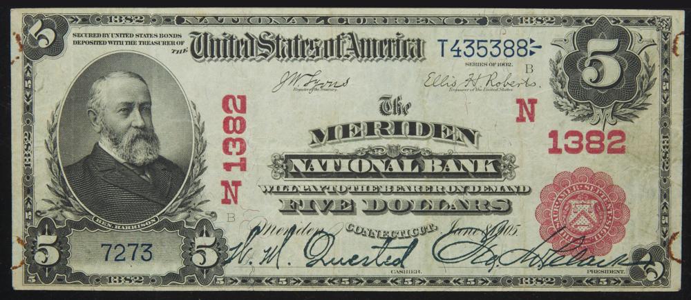 Lot 76 of 2038: $5 National Bank Note. Meriden NB of Meriden, CT. Ch. 1382. Fr. 587. PMG Very Fine 25 Net.