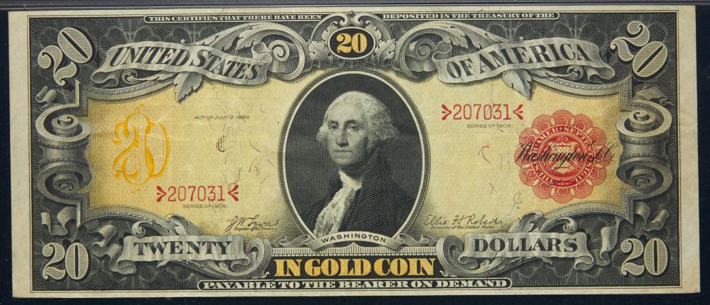 Lot 82 of 2038: 1905 $20 Gold Certificate. Fr. 1179. PMG Very Fine 30 EPQ.
