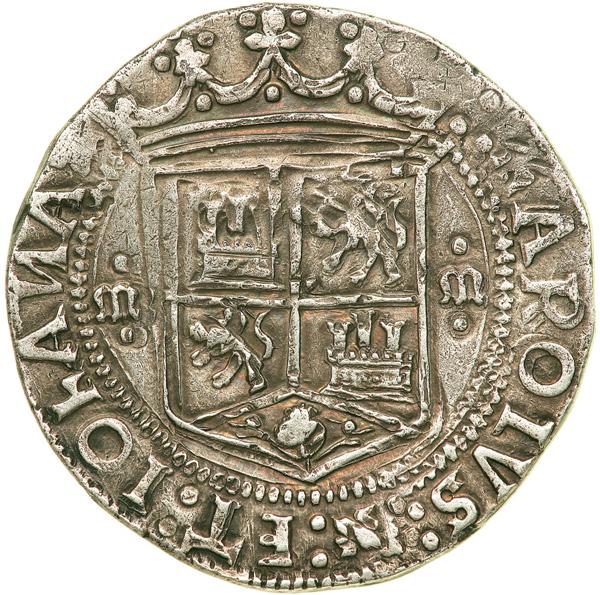 NGC graded AU-50. The coins of Carlos and Johanna are undated, but the meticulous records of the Spanish enable us to match the assayers' initials with the dates of their employment. Thus, we can pretty much determine the dates of the coinage.