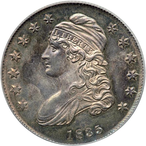 1835. O-109. Rarity 2. ICG graded MS-65. Mottled iridescent toning over semi reflective surfaces on both sides. A solid gem in all regards. The satiny surfaces are alight with sizzling luster, the strike is clear-cut, and the eye appeal is nothing short of exceptional. On this variety, the date is in a straight line while stars 7, 11 and 13 are recut. On the reverse, the small 5 is nearly closed and the C is much larger than 50.