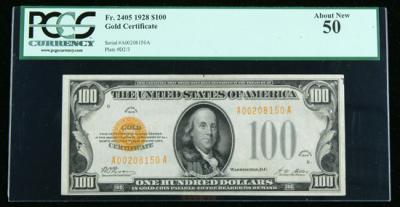 1928, $100 Gold Certificate. PCGS About New 50. Fr-2405. . KL-2747. This small size Gold C-note possesses all the flair and eye appeal of a much higher grade, and the gold overprint is bright and bold.