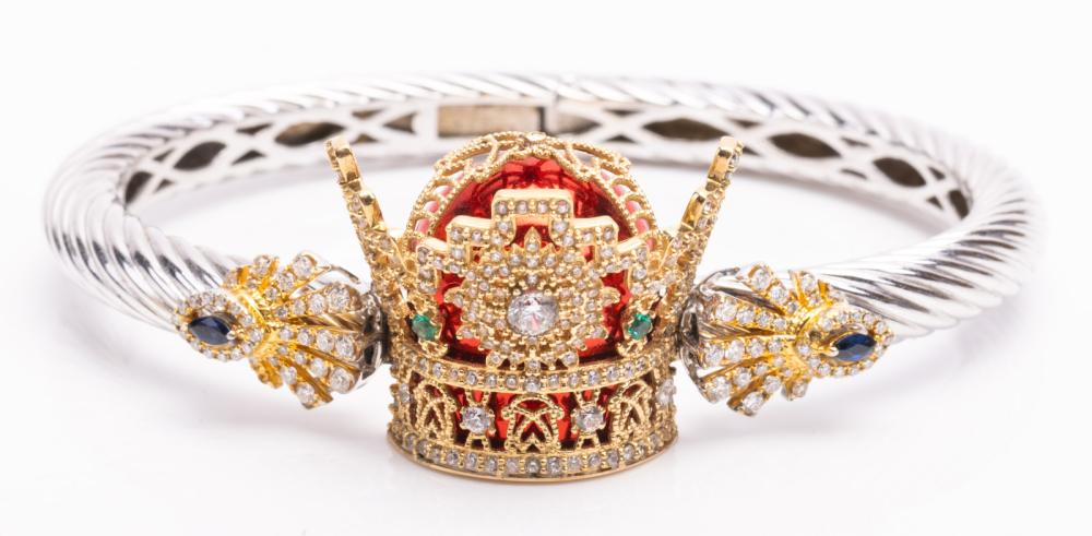 Lot 541 of 1487: Ladies Spectacular 14K Yellow and White Gold Pahlavi Crown Bracelet with 5 Man Made Diamonds and Real Accent Diamonds and Sapphi