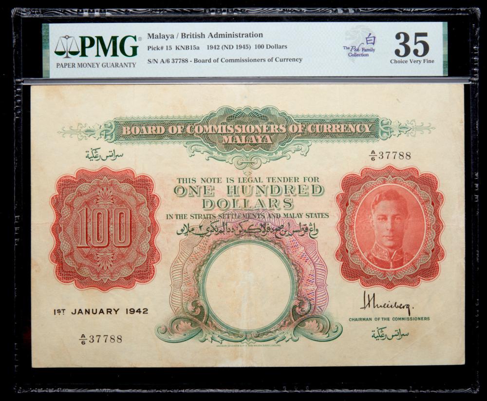 Lot 1467 of 1971: Malaya / British Administration. 100 Dollars, 1942 (ND 1945)
