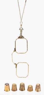 Lot 113 of 697: Five (5) Exceptional 14K Yellow Gold Thimbles, Basically Love Tokens During the Victorian Era Plus 14K Yellow Gold Magnifying Gl