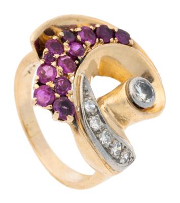 Lot 1360 of 404: Unusual Contemporary Ring in 14K Yellow Gold, a Swirl of Rubies and Diamonds