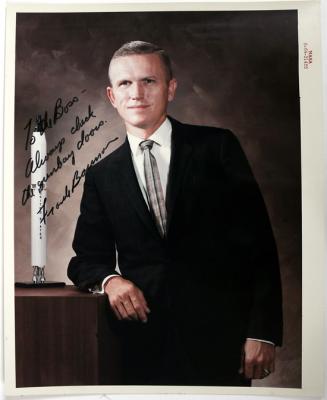Apollo 8, 1968, Frank Borman Autograph. On a NASA 8x10 glossy photo with red ID number. He has inscribed the photo: "To The Boss - Always check the gunbay doors". Pristine condition and rare.