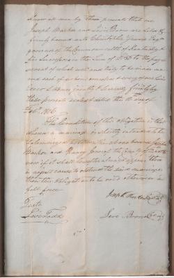 Todd, Levi (1756-1807) Kentucky pioneer, Revolutionary War veteran (one of the few officers to survive the Battle of Blue Licks on Aug. 19, 1782), a founder of Lexington, Kentucky. He was also Mary Todd Lincoln's grandfather. Autograph Document Signed as the witness to a promissory note between Joseph Barker and Levi Boone and Kentucky Governor Christopher Greenup, one page, 13 x 8 inches (Fayette County, Kentucky), Feb. 10, 1806. The document is also in the hand of Levi Todd, who was the first clerk of Fayette County, Kentucky. Matted with a medal honoring Kentucky pioneer James Harrod and framed to an overall size of 23¾ x 15 inches. Light toning, else fine.