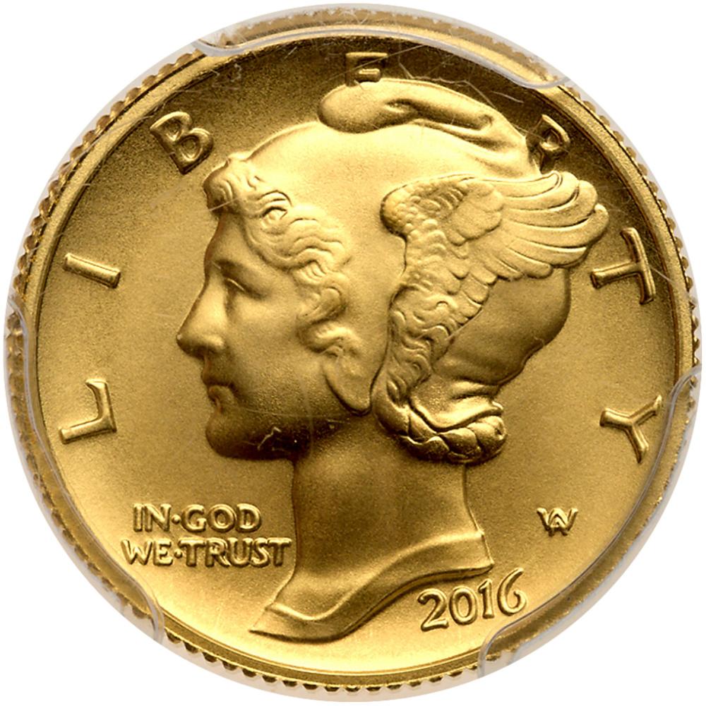 Lot 500 of 1906: 2016-W. Mercury Dime Centennial 1/10th ozt 24K Gold Coin