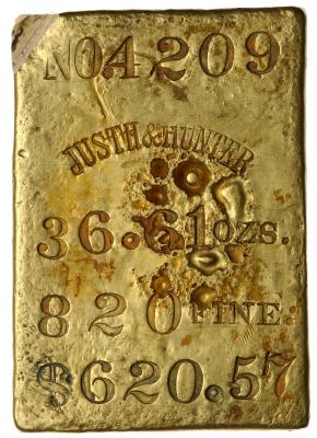 Lot 457 of 1906: Justh & Hunter, Assayers Gold Ingot Bar. No. 4209. Fineness: 820. Troy Ounces: 36.61
