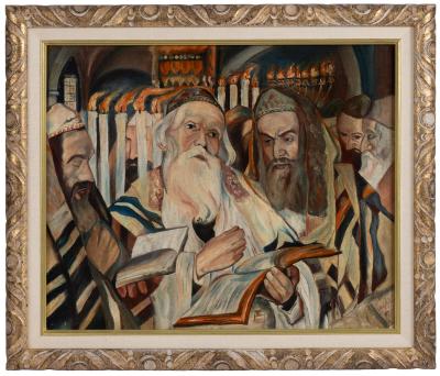 Lot 16 of 968: 1930s Polish Painting of Rabbis Gathered in a Synagogue. Artist Appears to be Orlitzky