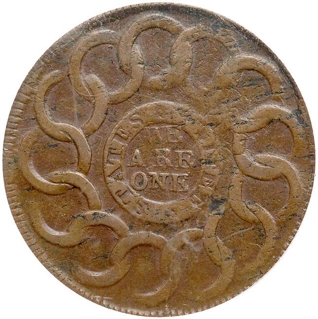 Lot 9 of 767: 1787 Fugio Cent. Pointed rays, 4 cinquefoils, "STATES UNITED"