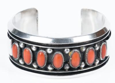 Lot 1005 of 459: Sterling Silver Cuff Bracelet with Coral Cabochons, Marked "J.S."
