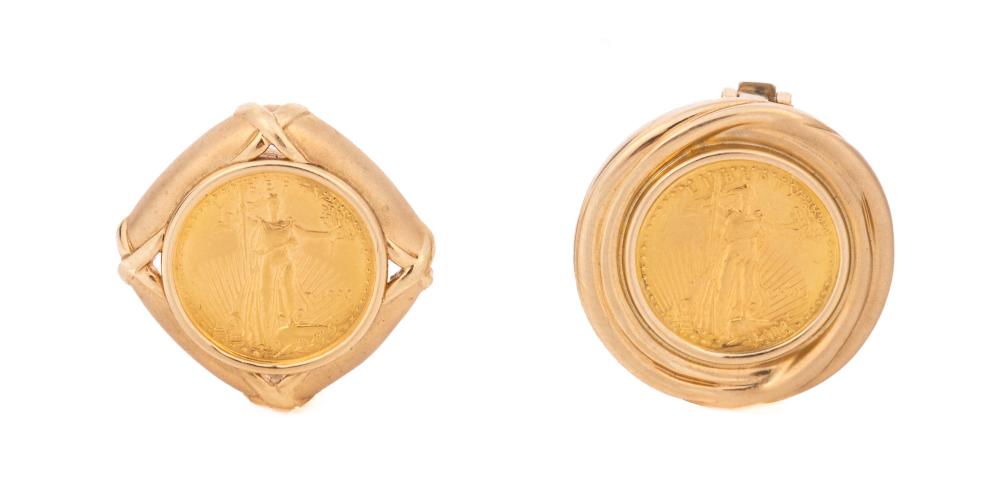 Lot 1033 of 459: Two Mis-Matched Earrings Each with a $5 Gold Piece with 14K Yellow Gold Mounts