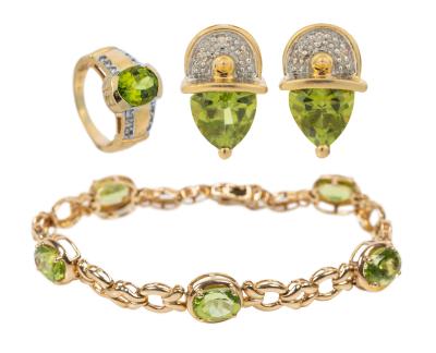 Lot 1038 of 459: Stunning Ensemble for the Lady in 14K Yellow Gold and Peridot. Mint, Never Worn. Ring, Bracelet, and Earrings