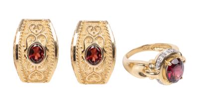 Lot 1040 of 459: Elegant 14K Yellow Gold and Garnet Earrings with Complimenting 14K Gold Dinner Ring with all Garnets Matching in Color, Perfectl