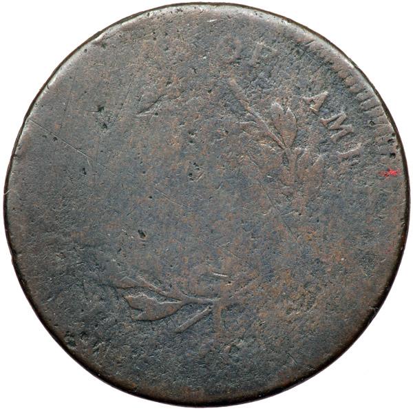 1797 C-1 R2 1 Above 1 Variety AG3. Double Struck with Rotation. Glossy chocolate brown. The planchet is reasonably smooth but there is an obvious patch of pitting left of the top of the cap. No verdigris or significant contact marks. Double struck. Both strikes were centered on the planchet but they were rotated 150 degrees between the impressions. LIB shows clearly just left of the date and a second date (which is weaker but readable) is positioned above the forehead of the dominant (second) impression. Similar doubling shows on the reverse, but it is less obvious. OF AM is positioned where the fraction and UN should be visible. MDS, Manley state 3.0, showing obvious swelling on the obverse. Weight 77.6 grains. Davy #97.1.11.