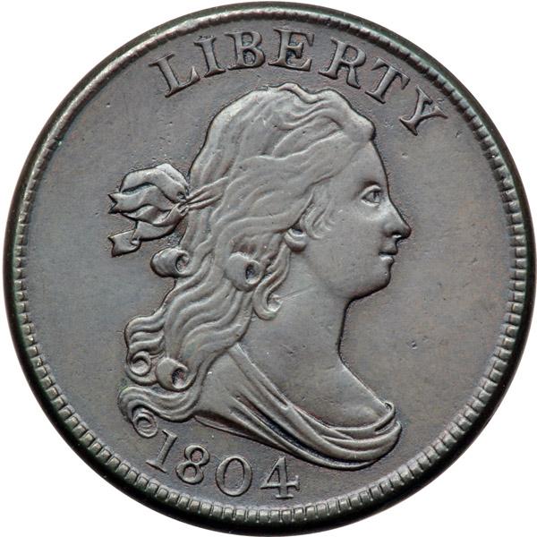 1804 C-9 R2 VF25. Ten points sharper but lightly burnished and retoned a rather glossy dark steel and olive. No roughness, and the only marks are a light rim nick over the I in LIBERTY and another shallow nick on the left side of the O in OF. A second example of the extremely rare earliest state of the variety, Manley state 1.0 early, with an uncracked obverse. Davy #04.9.20.