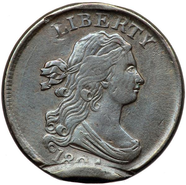 1804 C-13 R1 Plain 4 without Stems VF20. Tab Double Strike. Sharpness EF40 but the tab from the off center second strike was tapped down to restore the proper round shape of the half cent, and the rim opposite the tab was also flattened a bit in the process. Attractive glossy steel and light olive with subtle overtones of light bluish steel. Frosty luster covers the protected areas. This piece presents quite a challenge to figure out a logical sequence of events, but it certainly was struck more than once. It appears it was struck normally the first time but the piece failed to eject completely and the dies struck it a second time 90-95% off center leaving a tab extending off the edge. The portion of the tab over STATES has much of the BE in LIBERTY showing. However, it appears that when the tab was tapped down to restore the proper round shape of the half cent the tab folded over and the "BE" started out on the obverse side of the centered strike. Unfortunately the "BE" is retrograde when viewed as part of a tab strike (but in normal relief, not incuse) and would appear that way from either side if it was part of a tab impression. Conversely, the "BE" reads properly if it was part of a normal centered strike. Apparently there was more going on here and more than two strikes may have been involved. It also appears the obverse part of the tab was struck against a new blank planchet rather than the die as there are no traces of dentils. This is an impressive mint error, but you can hurt your head trying to figure out exactly what happened. Davy #04.13.14.