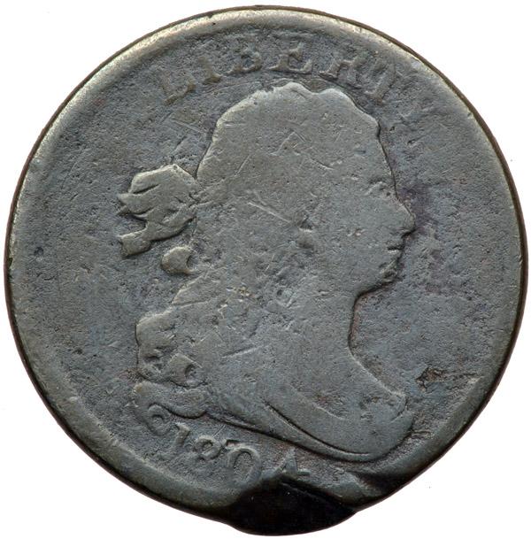1804 C-13 R1 Plain 4 without Stems G4. Tab Double Strike, Off Center Reverse Brockage Maker. Slightly sharper but the surfaces are covered with extremely fine roughness that dulls the natural gloss. No verdigris or notable contact marks. Slightly glossy dark steel and olive. Double struck. The first strike was normal and centered on the planchet. The piece then failed to eject completely and was struck a second time 90% off center with a new blank planchet also in the press. The obverse was struck by the obverse die about 90% off center and at an angle thanks to part of the new blank planchet being in the way leaving ERT from LIBERTY under the 04 in the date. An impressed arc from the new blank planchet shows at ES-OF, deepest at ES thanks to the two planchets not being on the same plain when the dies pressed against them. That couldn't have been good for the dies or the press, but it's good for us. Davy #04.11.14.
