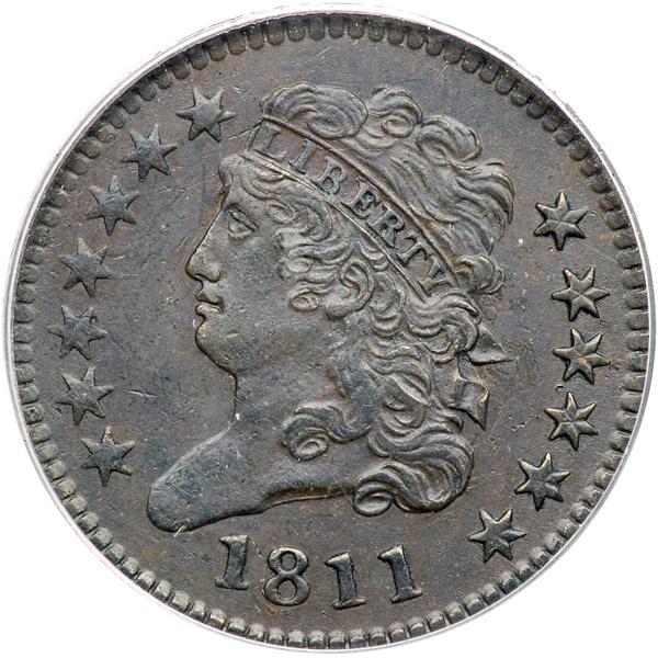 1811 C-2 R3. PCGS graded AU-50. Glossy dark chocolate brown. There are a few microscopic contact marks, including rim nicks at M and RI in AMERICA. MDS, Manley state 2.0, with fine but clear die clashmarks behind the head and above the date. A sharp, very attractive example of this tough date.