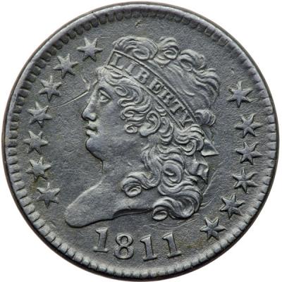 1811 C-2 R3 VF25. Sharpness EF40 with uniform microscopic roughness under a slightly glossy dark steel brown patina. No verdigris, and the only mark is a short boomerang-shaped scratch in the field before the eye. LDS, Manley state 3.0, with stronger die clashmarks above the date. The die crack at OF and AMER is clear. Plated in the first edition of the Cohen book to illustrate the variety (page 65). Davy #11.2.8.