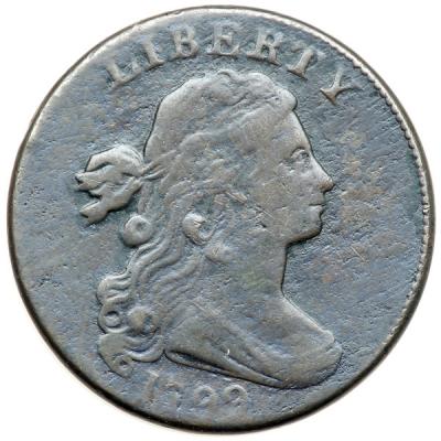 1799 S-189 R2 VG7. Sharpness F15 but covered with fine roughness, strongest in the protected areas. There are traces of very shallow planchet scale in some of the protected areas but no verdigris. The only notable marks are a small rim nick left of the upper edge of the hair ribbon and a couple tiny nicks at the base of the 17 in the date. Slightly glossy dark olive and steel with lighter chocolate brown toning on the highpoints. The obverse displays a considerable amount of gloss thanks to some very light burnishing done long ago, but the reverse is closer to matte. E-MDS, Breen state II. The shallow lump over T in CENT is present but weak and there is no die crumbling in the dentils at F-A. The bottom of the date is relatively weak, which Breen mentions as normal for this die state, while the legends on both sides are complete and clear.