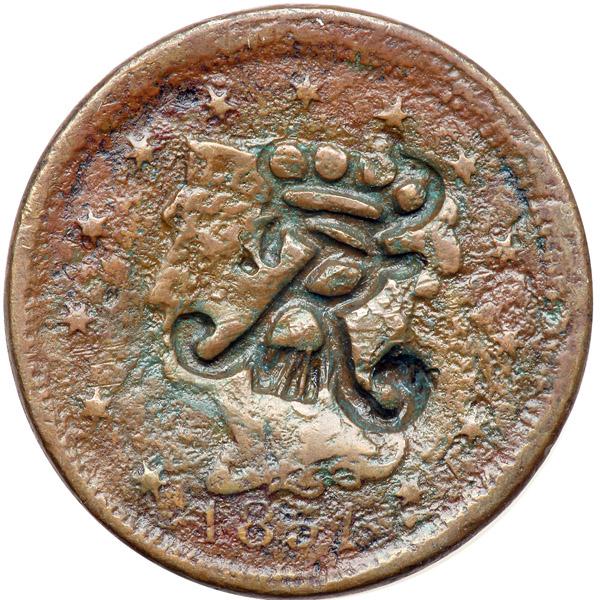 1851 Large Cent with Danish West Indies Counterstamp AG3. The large cent is moderately corroded causing many of the cent details to be weak or distorted, but the crowned FR/VII counterstamp (for Frederik VII of Denmark, 1848-1863) is clear and deeply impressed. Rather glossy chocolate brown with shallow greenish verdigris in protected areas, including in the recesses of the counterstamp. This stamp was for the Danish West Indies (now the U.S. Virgin Islands) and it was applied to circulating U.S. and world coins between 1849-1859. Many counterfeits of this rare counterstamp are known, and this cent comes with a tag from NGC stating "NOT ENCAPSULATED" and "AUTHENTICITY UNVERIFIABLE." The piece looks good, but we defer to NGC on this one. Careful inspection is recommended.