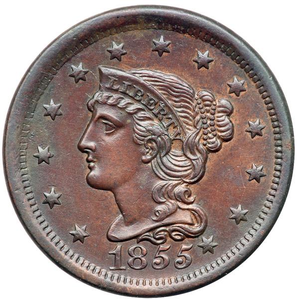 1855 N-9 R1 Knob-on-Ear AU50. Sharpness very close to mint state but lightly cleaned and retoned glossy reddish chocolate and olive brown. Otherwise free of marks or other defects. MDS, die state d. The "Knob" break is clearly raised, but not quite as much as on the preceding two lots.