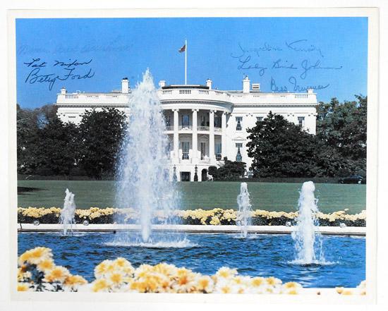 Color Portrait of the White House Signed by Six First Ladies, Color photograph of the White House signed by six First Ladies, three on each side of the flag. They are from top to bottom, left to right:
