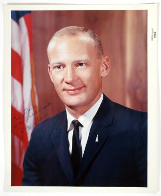 Apollo 11, 1969, Buzz Aldrin Autograph, on an original NASA 8x10" glossy color photo which he has inscribed: "To Marie with Kindest Regards, Buzz Aldrin". This photo was inscribed early in his NASA career. Fresh and clean.