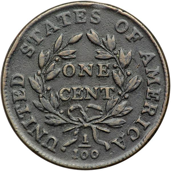1798 S-170 R3 Small 8, Style II Hair VF20. Slightly sharper with a couple light rim bruises on both sides, the strongest one off the lower end of the wreath ribbon. Glossy chocolate brown with lighter brown toning on the highpoints. There is a very small planchet clip under the 17, as struck. E-MDS, Breen state II, prior to the arc crack behind the portrait. The reverse is rotated 30 degrees CCW.