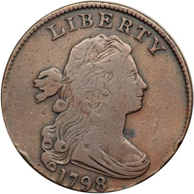 1798 S-176 R4 Small 8, Style II Hair VG10. Very slightly sharper with several light rim bruises at the bottom of the obverse. The only other marks are a spot of darker toning at the front edge of the neck and a shallow spot of reddish verdigris at the base of EN in CENT. Otherwise the surfaces and eye appeal of this piece are quite nice for the grade. Rather glossy medium brown. The date and legends are complete and bold. M-LDS, Breen state VI. Struck slightly off center to K-6 leaving the bottom of the date tight to the edge.