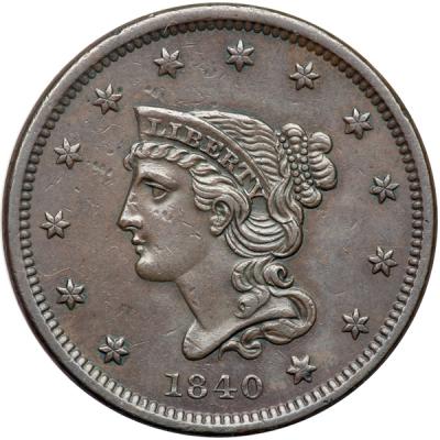 1840 N-12 R1 Small Date VF35. Five points sharper with a few too many tiny nicks on the obverse, none notable. Glossy chocolate and steel. LDS, die state b (Newcomb's old #13). The small lump under the 1 is gone.