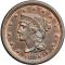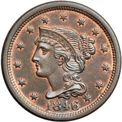 1846 N-11 R1 Medium Date MS62+. Glossy chocolate and steel brown with nearly 20% of the mint red remaining, mostly on the reverse. Excellent eye appeal, close to MS63. The only marks are a small splash of darker olive toning at the 84 and faint traces of an old fingerprint between stars 8 & 9. Nicely struck EDS, die state a. The fine die lines from the dentils under the date are clear and all the stars show radial lines. Tied for CC#4 in the Grellman census.