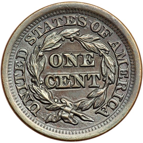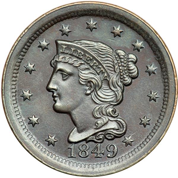 1849 N-2 R2 MS62. Frosty chocolate brown and olive. Sharply struck, especially on the portrait which displays needle-sharp details. Essentially flawless. The best identifying mark, and it is barely visible, is a light rim nick at star 13. MDS, die state m. Light crumbling connects the tops of the O & N in ONE but crumbling has not formed on berry #6.