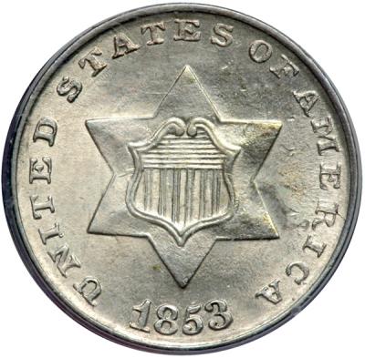 1853. PCGS graded MS-63 PQ. Housed in a First Generation Holder. A nice example. The silver three-cent pieces of 1851-53 were struck in a composition of .750 silver and .250 copper. In 1854, and throughout the remaining years of the series, the coins were produced from a composition of .900 silver and .100 copper, thus finally measuring up to all the other silver denominations of the era