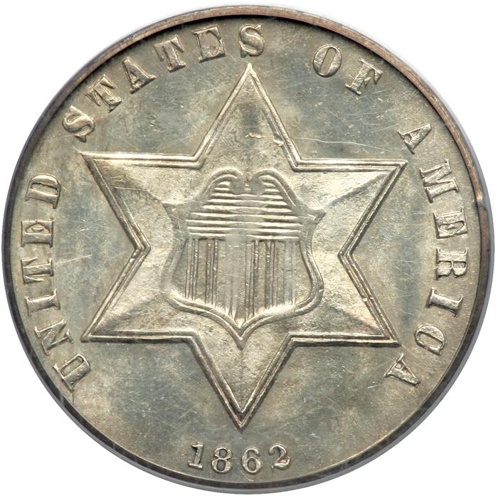 catalog Auction info Buyers Premium of 20.00% added to each and every lot The May Pre-Long Beach Auction(#69) 05/27/2012 10:00 AM PDT CLOSED! Lot 499 of 4936: 1862 Silver Three Cents. PCGS MS63 Click image to enlarge PreviousNextSimilar Items Lot closed - Winning bid:$260 (6 bids) Estimate: $160 - $170 Remove from watchlist Add to watchlist Tell a friendAsk a question The May Pre-Long Beach Auction(#69) 05/27/2012 10:00 AM PDT CLOSED! Description Description: 1862. PCGS graded MS-63. Frosty and untoned. Only 10,000 examples are estimated to have survived (PCGS # 3680) . Estimated Value $160 - 170. Categories: Silver Three Cent Pieces