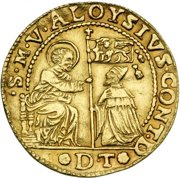 Italian States - Venice. Osella, 1683. CNI-191 var; Mont-999; Pa.166 (date unrecorded in gold). Struck in Gold. 13.81 grams. Anno VIII. Alvise Contarini, 1676-1684. Doge kneeling before St. Mark, with extended banner on obverse, DT in exergue.