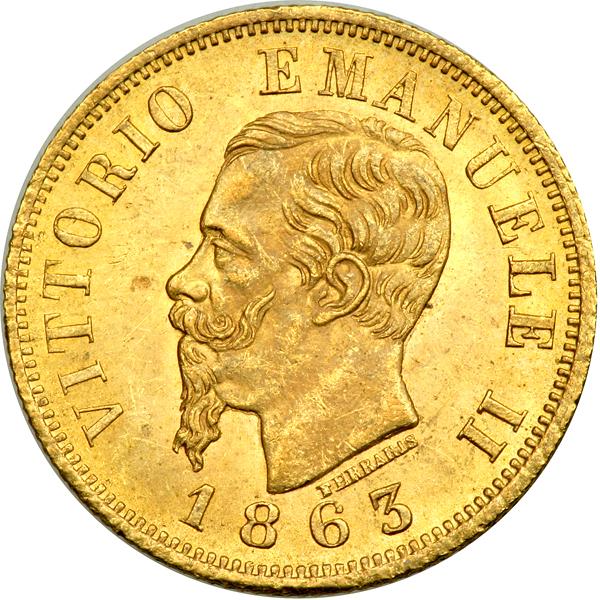 catalog Auction info Buyers Premium of 20.00% added to each and every lot The May Pre-Long Beach Auction(#69) 05/27/2012 10:00 AM PDT CLOSED! Lot 4128 of 4936: Italy. 10 Lire, 1863-T BN. NGC MS63 Click image to enlarge PreviousNextSimilar Items Lot closed - Winning bid:$220 (1 bid) Estimate: $200 - $250 Remove from watchlist Add to watchlist Tell a friendAsk a question The May Pre-Long Beach Auction(#69) 05/27/2012 10:00 AM PDT CLOSED! Description Description: Italy. 10 Lire, 1863-T BN. Fr-15; KM-9.2; Pagani-477. 18.5 mm. Vittorio Emanuele II. NGC graded MS-63. Estimated Value $200 - 250. Categories: World Gold Coins