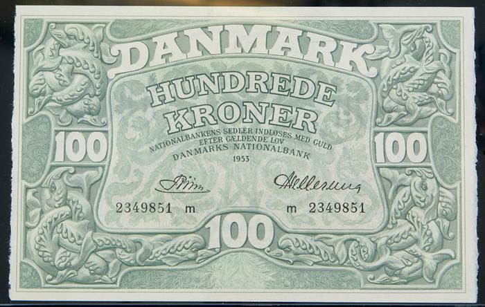 Denmark SCWPM# 39j, 1953 100 Kroner. PCGS Choice About New 58PPQ. A lovely high grade example that has a single light bend, otherwise it appears fully Gem New. It is first of a consecutive pair, the second of which is the Gem example offered in the lot prior to this one.