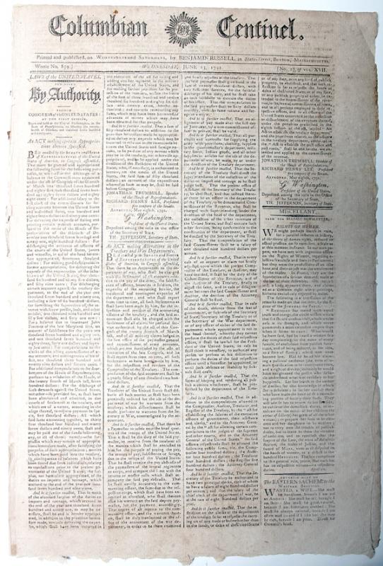 [Washington, George] Columbian Centinel, Boston, June 13, 1792. 17 x 11½ in., 4 pp. Printed and published by Benjamin Rush. Two Acts signed in script type by Washington as President. Regarding appropriations and alterations to the Treasury and War Departments. The second Act contains an "Act to establish the post office and post roads…." Both Acts are dated May 8, 1792 and are countersigned in type by Thomas Jefferson as Secretary of State, Jonathan Trumbull as Speaker of the House of Representatives, and Richard Henry Lee as President pro tempore of the Senate. Page 2 has a notice by Dr. William Aspinwall about smallpox inoculations; pages 3 and 4 have 19 ship woodcuts, and page 4 has an ad for the first and second parts of Thomas Paines'