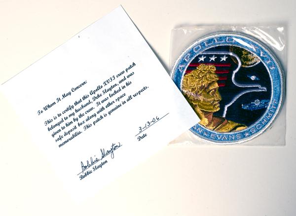 Apollo 17, 1972, "White Eagle" Crew Patch (4") This patch is in its original plastic envelope with an oval "A-B Emblem" decal on the reverse. Included is a COA that reads: "This is to certify that this Apollo XVII crew patch belonged to my husband, Deke Slayton, and was given to him by the crew. It was locked in his safe deposit box along with other space memorabilia. This patch is genuine in all respects / signed Bobbie Slayton". A rare patch in pristine condition.