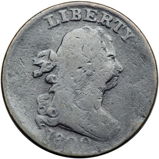1800 C-1 R2 G5. Double Struck. The obverse is a bit better while the reverse is weaker and has traces of fine roughness on the left side. Glossy olive with lighter steel brown toning on the devices. Double struck on the obverse with a rotation of 15-20 degrees between the impressions. Obvious wide doubling shows from the top of the head to the throat. The reverse shows no trace of a second strike, which suggests it was pressed into a new blank planchet during the second strike, thereby creating a reverse brockage on the new planchet.