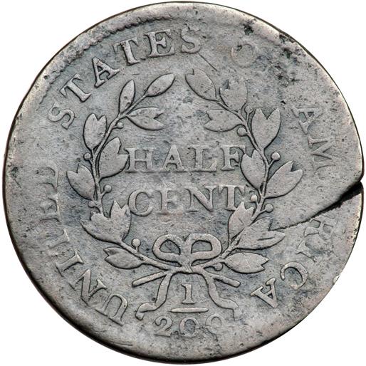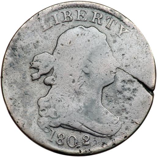 1802/0 C-2 R3 Overdate 2 over 0, Reverse of 1803 AG3. Sharpness VG7 but flattened a bit with patches of shallow corrosion on both sides. No verdigris. A significant planchet crack extends from the tip of the nose to the rim opposite the chin. Glossy steel and chocolate with minor splashes of darker olive brown. E-MDS, Manley state 2.0. The date and overdate and strong and the legends are complete except for the E in AMERICA, which is affected by the planchet crack.