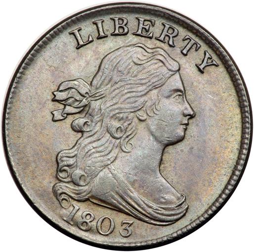 1803 C-3 R2. PCGS graded MS-63 Brown. Lustrous light olive and steel brown with overtones of light bluish steel on the reverse. Great eye appeal and virtually flawless. No spots or stains, and the only mark is a barely visible thin nick above the A in HALF. Manley state 4.0 showing myriad die lapping lines from IBE to the head and ribbon. The upper part of the wreath is softly struck, as always in this die state, but everything else is nicely impressed. This is the Manley plate coin for the 4.0 die state.