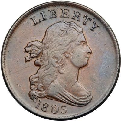 1803 C-4 R4 VF35. Triple Struck Obverse. EF40 sharpness but there are some light contact marks at the top of the wreath plus a few more scattered over both sides, none notable but more than you expect for an EF40 coin. Glossy chocolate brown with lots of frosty light brown toning in protected areas and an area of darker olive brown toning in the field before the chin. The obverse was struck three times with a small offset between impressions of no more than a half millimeter. Nonetheless evidence of the three strikes is clearly evident on the date and all devices. The reverse, however, shows no trace of more than a single strike, and the fields on that side are slightly prooflike. The reverse is rotated 10 degrees CW.