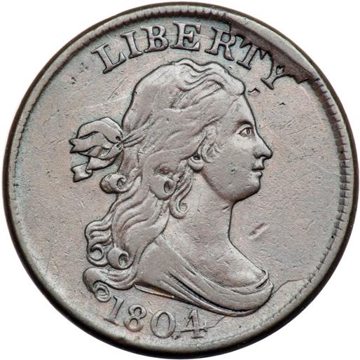1804 C-9 R2 VF20. Choice glossy medium chocolate brown with frosty bluish steel in protected areas on the reverse. Smooth surfaces. The only marks are a pinprick under the Y in LIBERTY and a dull nick in the field before the neck. Very late die state (VLDS), Manley state 5.0 late. A strong cud break joins RTY to the rim above and a crack reaches from the 04 through the bust tip to the dentils at right. Another die crack reaches through the bases of the 180 to the rim under the lowest curl.