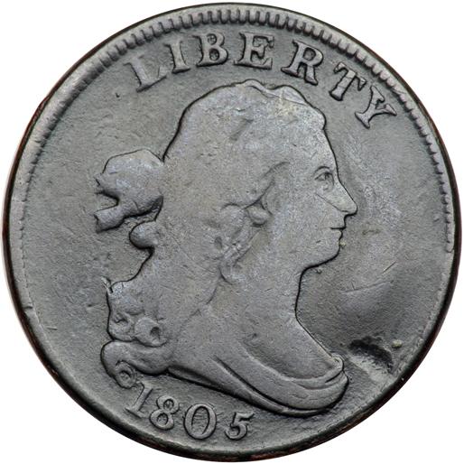 1805 C-3 R4 Small 5 with Stems VG7. Very slightly sharper but the reverse is covered with uniform extremely fine granularity that dulls the natural gloss on that side. The obverse is glossy and offers much nicer eye appeal. Both sides are toned steel and chocolate brown. There are a couple microscopic specks of verdigris on both sides, some very faint hairlines on the obverse, and a smooth but relatively deep planchet void (as struck) in the field off the bust tip. LDS, Manley state 2.0. The swelling in the field before the portrait is strong. The date is bold and the legends are clear except for the usual weakness at HA and CE in HALF CENT.
