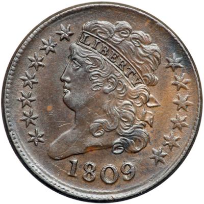 1809 C-6 R1 EF45. Rotated Reverse. Slightly sharper but there is a very fine scratch on the bust. Otherwise this piece is choice and the eye appeal is outstanding for the grade. Lustrous chocolate brown with some lighter brown toning on the reverse. A tiny speck of lighter brown toning midway between star 2 and the chin is the best identifying mark. M-LDS, Manley state 5.0. The end of the wreath stem is mushy and the reverse is rotated 140 degrees CCW.