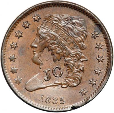 1835 C-1 R1 AU58 but Counterstamped JC in a Maple Leaf. This is Brunk C-62. Lustrous light steel brown with darker steel brown toning on the highpoints. A swipe of darker steel gray toning shows on the rim above ERI in AMERICA, and the planchet is incomplete at the rim right of the date where a small fissure reaches through the planchet. Basically this is a mint state piece that was strongly stamped in the center of the obverse. The stamp is in the shape of a maple leaf with the letters JC raised near the stem end of the leaf. Brunk lists 6 examples, all on 1835 half cents. Although we do not know who is responsible for this counterstamp, it appears a quantity of new 1835 half cents was used as host coins rather than pieces obtained from normal circulation. A neat piece.
